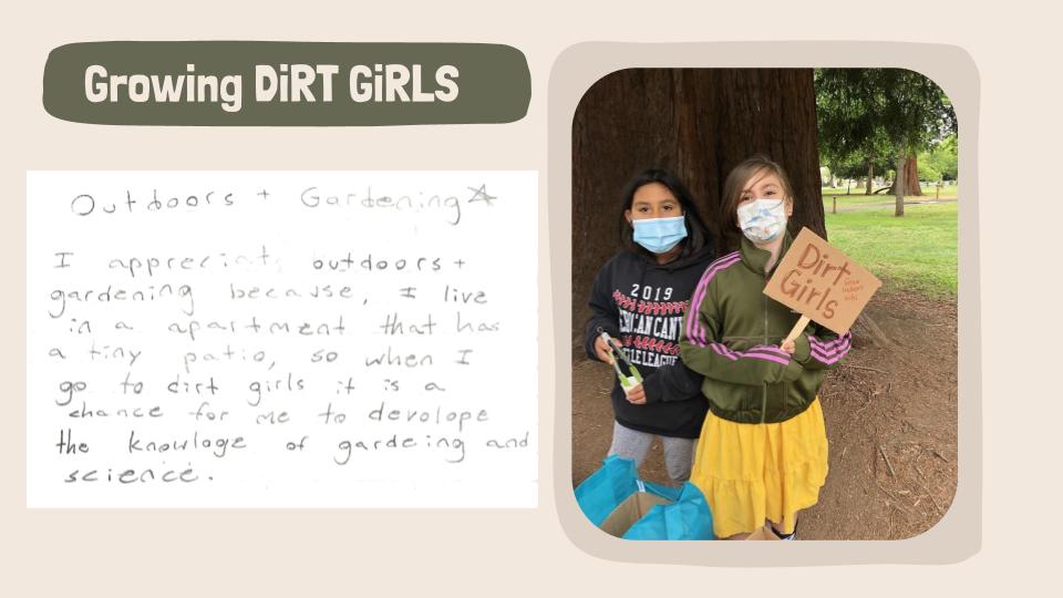 It’s especially meaningful for me to share the story of growing Dirt Girls at start of Women’s History Month. Pictured below are two girls from the last cohort of a “pandemic proof” version of the program offered last spring alongside a journal entry from one of the original Dirt Girls participants.