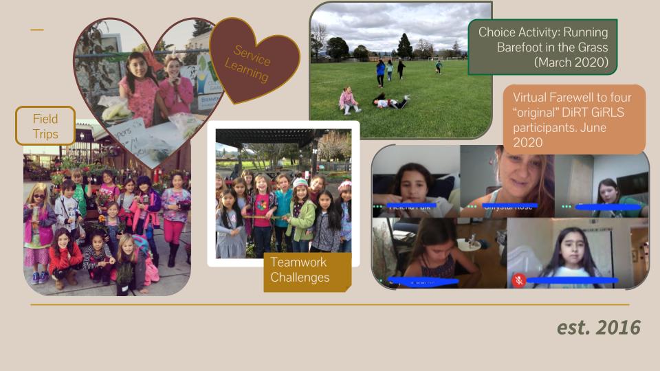 Over the following two years, the Dirt Girls grew into a strong group who loved engaging in garden tasks, practicing scientific habits of mind, and becoming dynamic and motivated young women. We participated in service learning, took field trips & hosted community events. In June of 2020, we bid a virtual farewell to four fifth grade girls who had been in the program since they were 2nd graders.