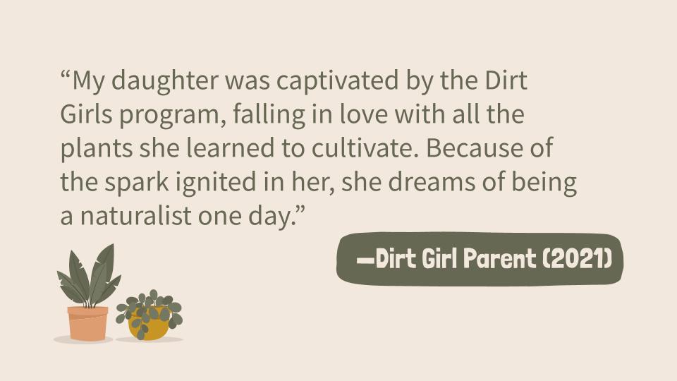 Without access to schools as a result of the pandemic, I developed a virtual program dubbed Dirt Girls Grow Indoors. I sourced houseplants and had them delivered to kids’ homes and then offered virtual programming on Zoom four times a week. We explored air plants, succulents, ferns, and terraria. Each month a new module also focused on cultivating resilience: learning to breathe, reduce stress, exercise our bodies and be creative. Although it was a bit of a departure from the outdoor version of the program, Dirt Girls Grow Indoors met the same goal: inspiring dozens of girls to pursue science as a career path, but also learning to care for herself, others, and the world.