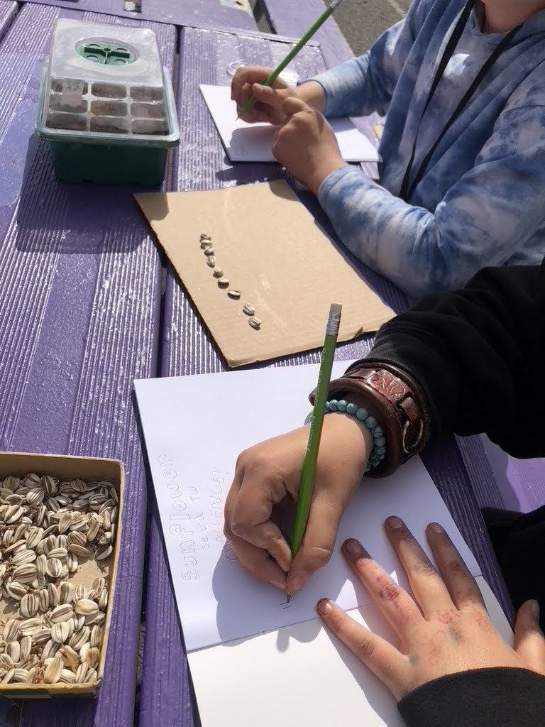 Planting is always a favorite task. We started the season with sunflower seeds, followed by gladiolus bulbs and edible crops. The garden club advisors at New Tech High were generous with sharing their planting space. This allowed Dirt Girls to sow two ‘three-sisters’ beds (an interplanting of corn, beans, and squash). We also planted a bed of sunflowers for seed saving, and a third containing a mix of edible herbs, vegetables and flowers for tasting (such as cilantro, pansies, radishes, potatoes, etc.). We even tried germinating redwood seeds with varying degrees of success (germination kits provided by One Tree Planted).