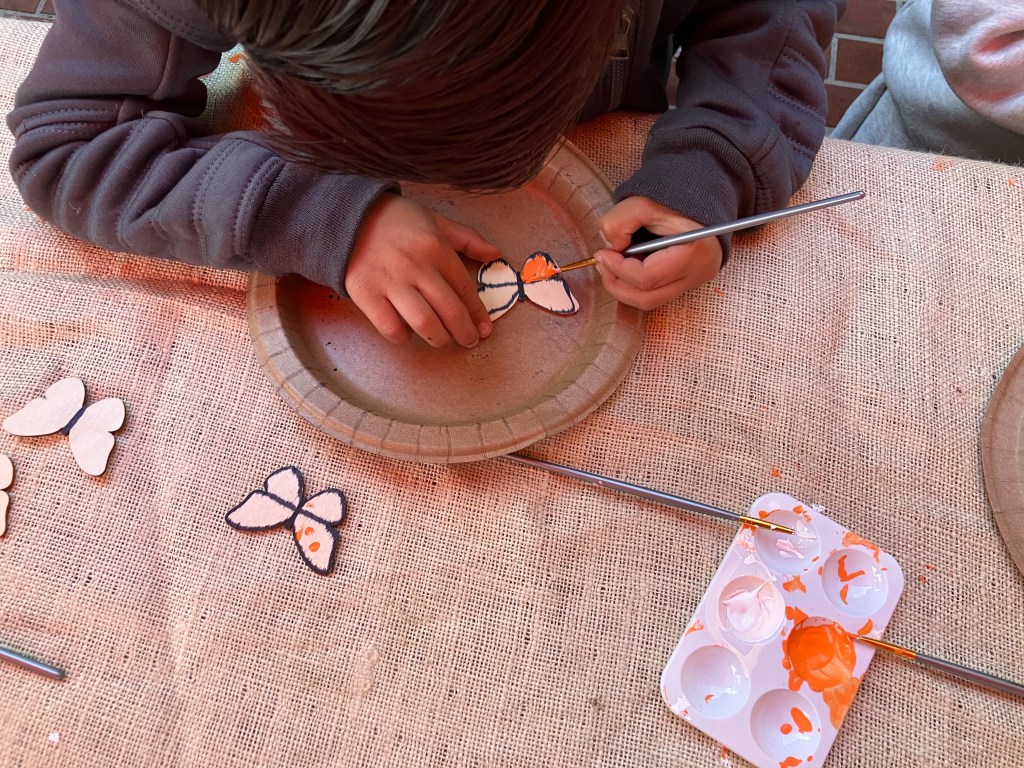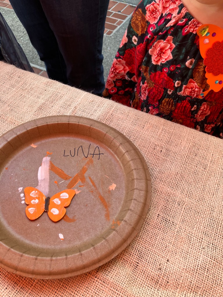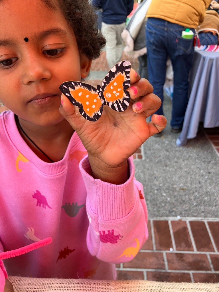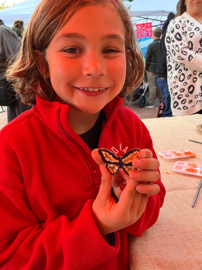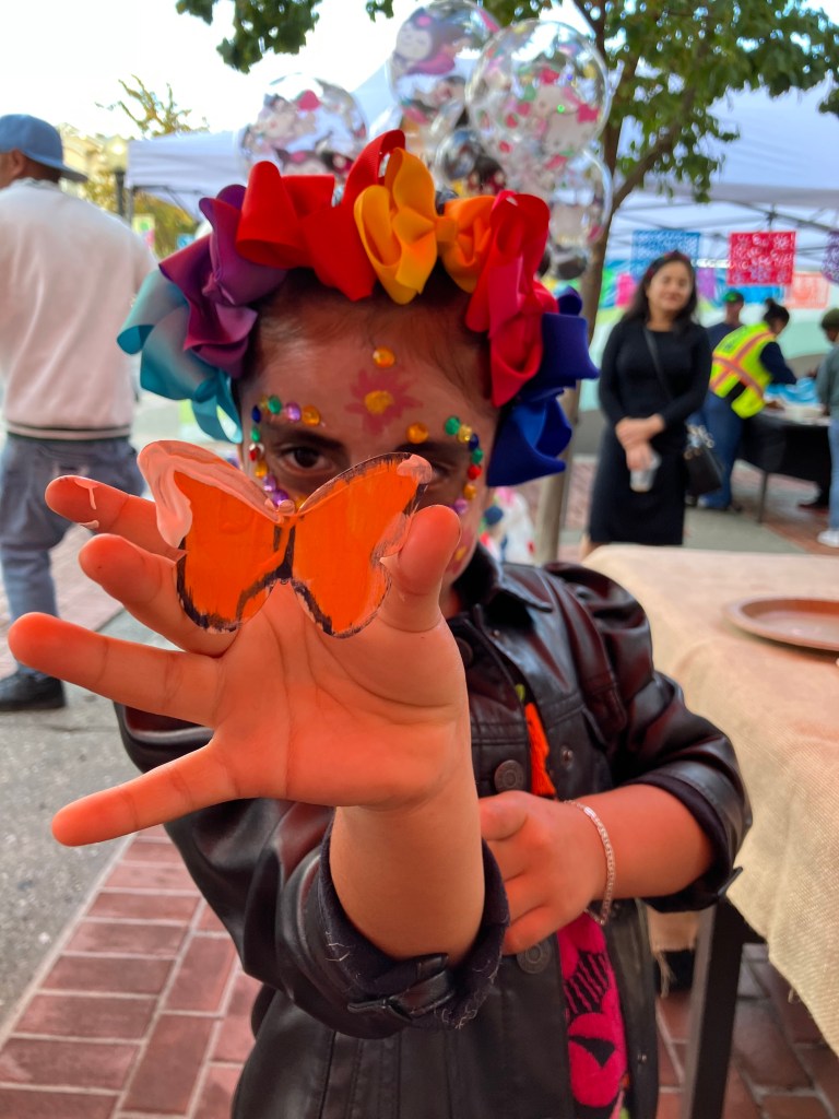 The intent of the downtown Napa event was to create space where our diverse Napa community “feels seen and heard through art, tradition, music, dance, and food.” It was a vibrant celebration of life and remembrance, with altars adorned by local artists, organizations, and schools. Our table was located in the children’s resources and craft area on the Brown Street Corridor. Dirt Girls leaders engaged kids with a monarch painting activity to celebrate the connection between monarch migration and Dia de los Muertos.