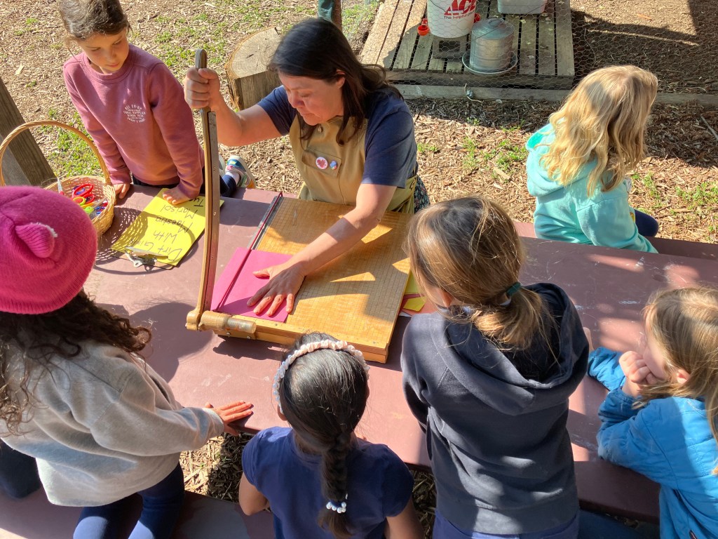 During our Teamwork Challenge, trios of participants made a paper chain, emphasizing the core values of teamwork and problem solving. We introduced the paper cutter, first discussing how it works (the handle acts as a lever; the blade slices the paper into strips) and what the important safety precautions are (keep fingers clear of the blade!). After distributing stacks of colorful strips, participants worked together to secure them into interlocking loops. Two problems we solved through teamwork were: how to work in the wind and how to best utilize our (not very sticky) tape.