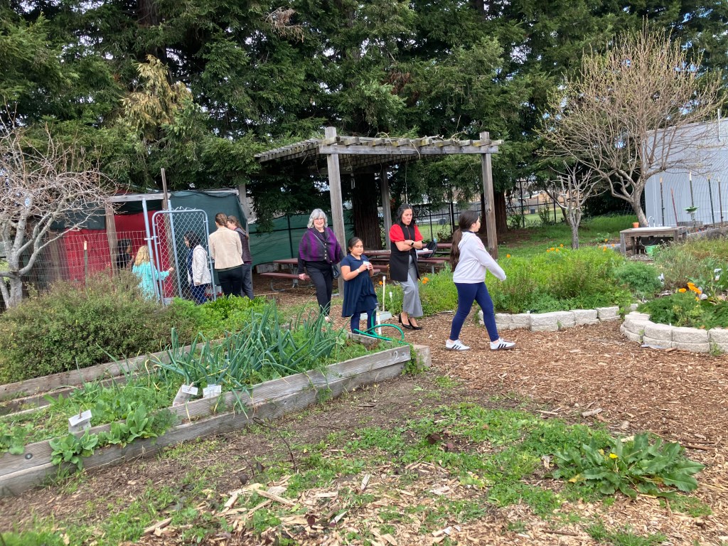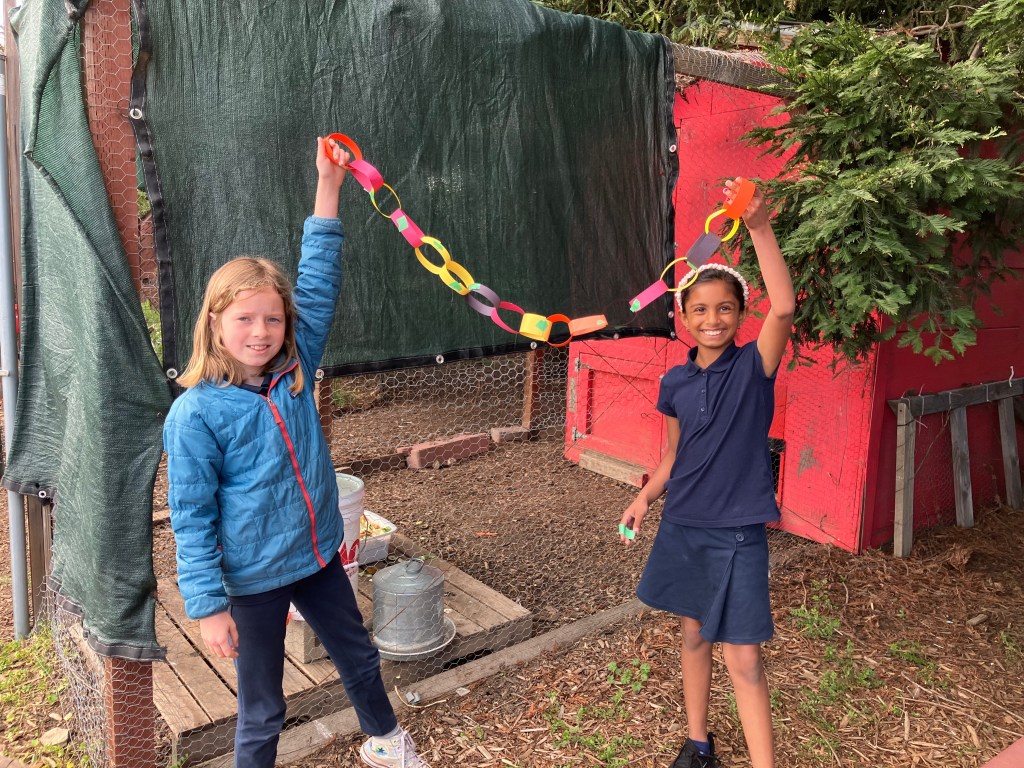 While the participants worked with the garden educator, Marisol, to put together the longest paper chain they could, I walked to greet our guests and escort them to the garden. We made introductions and then divided into smaller groups. The trios’ Choice Chore was deciding where to lead their guests, taking them on a brief garden tour. Some guests visited the chicken coop, while others examined the milkweed bugs huddled together on the apple tree.