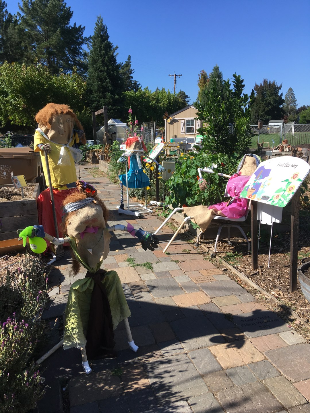DIY Scarecrows are a fun STEAM Project that promotes creative solutions, teamwork, and interdisciplinary thinking. Four different teams constructed unique and imaginative scarecrows. They collaboratively fashioned outfits from ripped nylon hammocks, scavenged props from the toolshed to rubber band in scarecrow's gloved hands, and bent wire into eyeglasses that even had tape lenses!